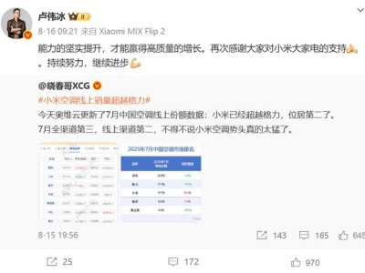 8月25日,格力电器市场总监朱磊通过微博再度发声,针对此前小米方面关于7月空调线上销售份额的言论进行反驳。朱磊强调“数据虽可转发,但口碑无法篡改”,并呼吁同行加入格力的“十年免费保修”计划。