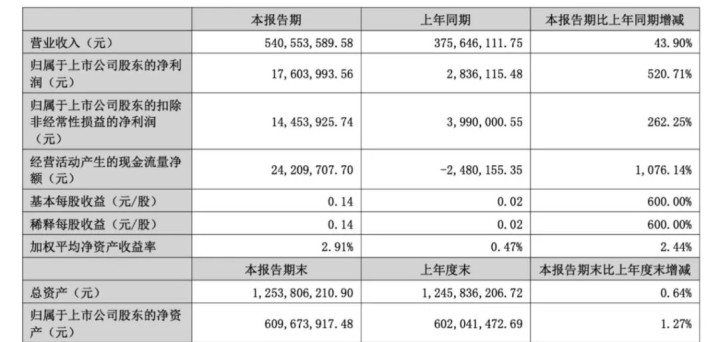 今年上半年,科创新源实现营业收入5.41亿元,同比增长43.9%;实现营业利润2367.15万元,同比增长405.78%;归母净利润1760.4万元,同比增长520.71%。